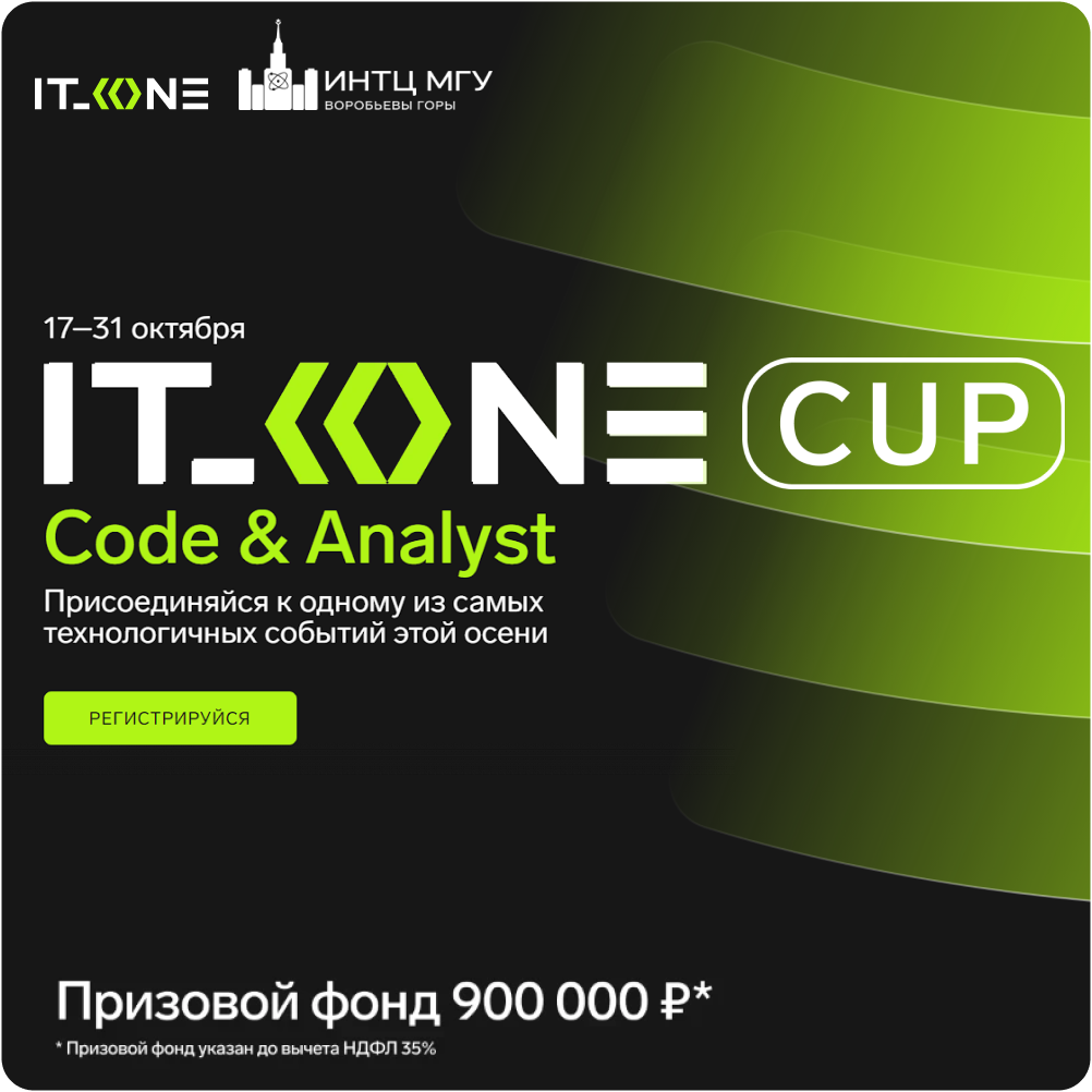IT_ONE и ИНТЦ МГУ приглашают на онлайн-хакатон IT_ONE Cup. Code & Analyst — соревнование для тех, кто хочет поработать над задачами из настоящей финансовой инфраструктуры.